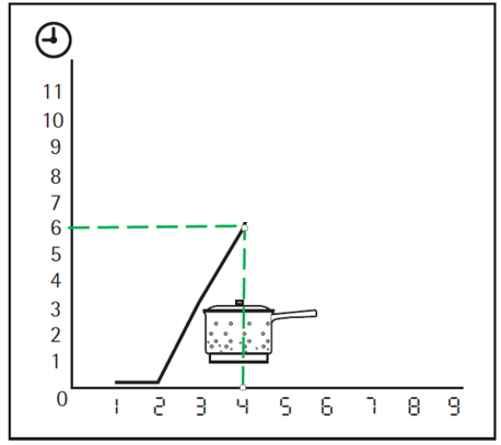 På billedet herunder (den grønne streg) skal retten have maks. varme i 6 minutter, derefter skal den tilberede videre på trin 4. Her vælger man ”A” og derefter vælge trin 4. Kogepladen vil skifte mellem A og 4 i displayet.