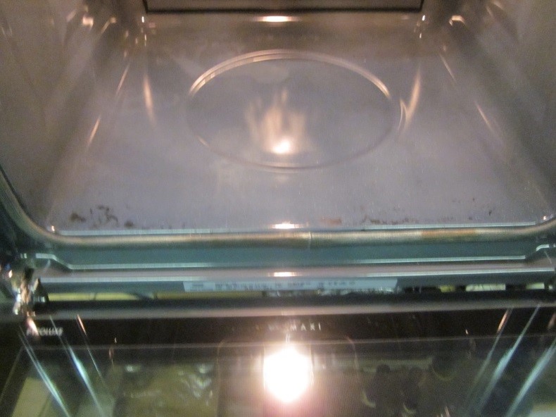 Se her eksempel hvor der er lidt snavs tilbage ved lågen efter Pyrolyse rens: