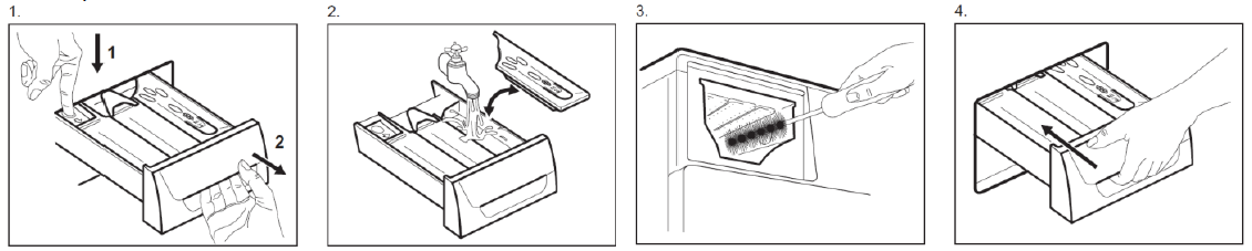 - Skyllemiddelindsatsen sidder ikke rigtigt, eller den er tilstoppet. Tag sæbeskuffen og skyllemiddelindsatsen ud og rengør dem.